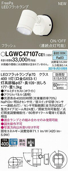 電圧:100VVA:10KVA:0.01消費電力:5.9W(固有)エネルギー消費効率:71.1lm/W色温度:5000KRa:Ra83メーカー/型番LGWC47107CE1 パナソニック 注意事項※画像方向以外取付不可カラーホワイトランプLED(昼白色) 5.9 LEDフラットランプφ70 クラス400 1灯(口金GX53-1) 仕様センサー付 防雨型 110Vダイクール電球60形1灯器具相当■検索コード 20210506■ジャンル 花・ガーデン・DIY エクステリア・ガーデンファニチャー ライト・イルミネーション 玄関灯■カテゴリ 照明器具 エクステリアライト スポットライト画像について※画像はイメージです。