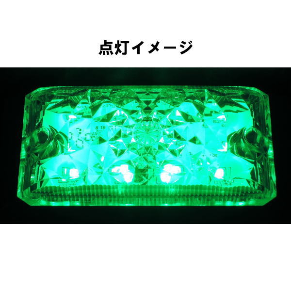抜群の視認性で車幅を確認!! 薄型タイプで広い照射範囲!! サイズ:縦58mm×横115mm×幅20mm ネジピッチ:80mm DC12V/24V車兼用 レンズ透明/LED緑 LED数:12個 光束:109lm 消費電力:2.52W メーカー名:日本ボデーパーツ工業(株)