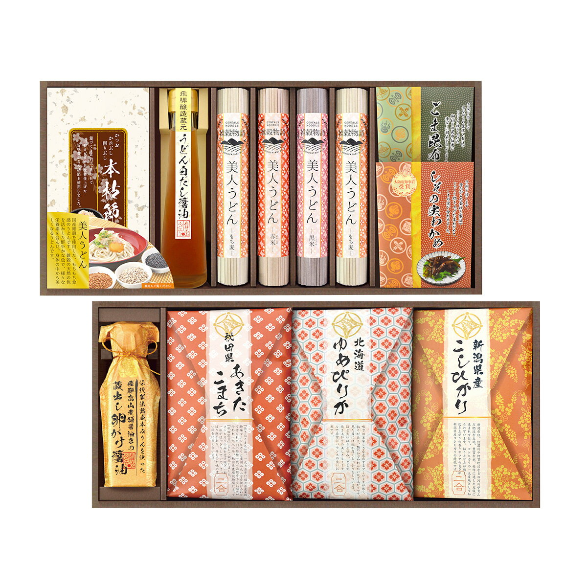 【名称】米ギフト【数量・内容】新潟県産こしひかり 2合(300g)×1、秋田県産あきたこまち 2合(300g)×1、北海道産ゆめぴりか 2合(300g)×1、美人うどん もち麦(1人前)×2、美人うどん 赤米(1人前)×1、美人うどん 黒米(1人前)×1、本枯節×4、飛騨醸造蔵元うどん白だし醤油(濃縮タイプ)120ml×1、ごま昆布佃煮45g×1、しその実わかめ佃煮45g×1、蔵出し卵かけ醤油120ml×1【賞味期間】製造より365日【原材料】【こしひかり】米(新潟県産) 【あきたこまち】米(秋田県産) 【ゆめぴりか】米(北海道産) 【美人うどん もち麦】小麦粉、もち麦粉、食塩 【美人うどん 赤米】小麦粉、赤米粉、食塩 【美人うどん 黒米】小麦粉、黒米粉、食塩 【うどん白だし醤油】しょうゆ(大豆・小麦を含む)(国内製造)、合わせだし(さば、うるめいわし、かつお、そうだかつお、むろあじ)糖類(砂糖、砂糖混合異性化液糖)、食塩、みりん、昆布エキス、かつおエキス、鰹節エキス/調味料(アミノ酸等)、アルコール、ビタミンB1、甘味料(甘草、ステビア) 【ごま昆布佃煮】昆布、蛋白加水分解物、還元水飴、砂糖、本みりん、醸造酢、ごま、食塩、酵母エキス/ソルビトール、調味料(アミノ酸等)、保存料(ソルビン酸K) 【しその実わかめ佃煮】わかめ、還元水飴、食塩、砂糖、蛋白加水分解物、しその実/ソルビトール、調味料(アミノ酸等)、保存料(ソルビン酸K) 【蔵出し卵かけ醤油】しょうゆ(小麦・大豆を含む)(国内製造)、みりん、かつおエキス、発酵調味料/調味料(アミノ酸等)、アルコール、酸味料、甘味料(ステビア、甘草)、ビタミンB1【仕様】掲載商品には、アレルギーの原因といわれる原材料を含んでいる場合がございます。