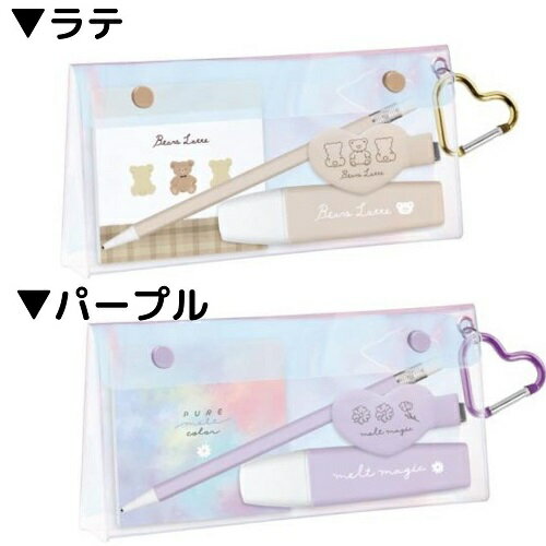 ▼セット内容 ・クリアペンポーチ ・蛍光ペン マーカー ・ミニメモ帳 ・前髪クリップ ・カラビナ ■販売サイズ:約 H10×W19×D5.5(cm) ▼4色よりお選びください。