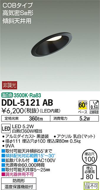 照明 おしゃれ かわいい 屋内大光電機 DAIKO 傾斜天井用ダウンライトDDL-5121AB 黒塗装 LED温白色 屋内・屋外兼用 白熱灯60W相当 埋込穴φ100mm 埋込深80mm