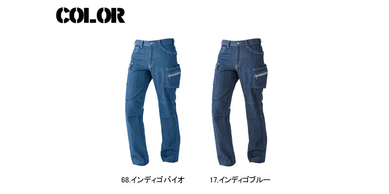 ■9466 ワークデニムカーゴパンツ 綿100%の10ozデニムを使用することで、着心地のよさを意識しながらワークシーンに対応できるような強いコシのある仕上げになっています。